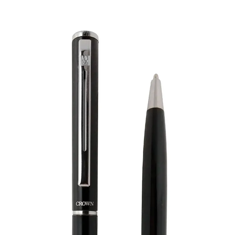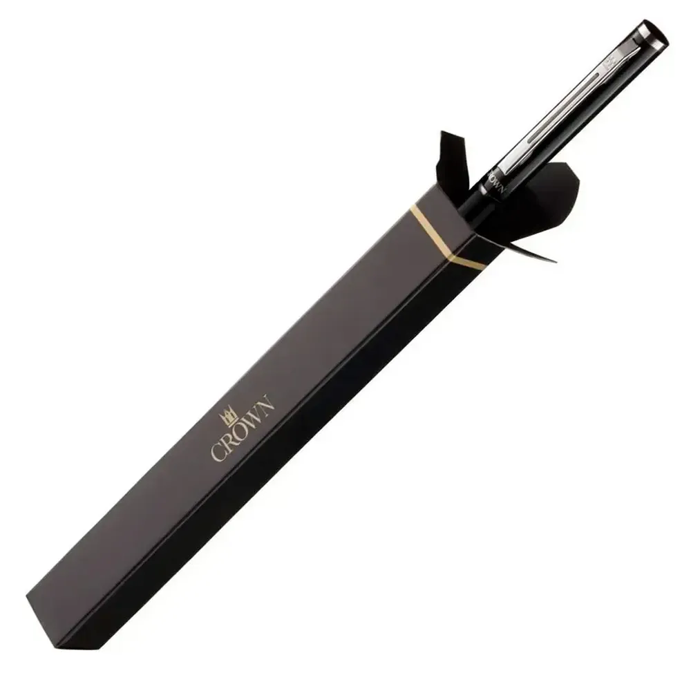 Caneta Baron Esferográfica Crown, com acabamento fosco e detalhes brilhantes, causando lindo contraste.